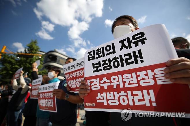(서울=연합뉴스) 박동주 기자 = 양경수 전국민주노동조합총연맹(민주노총) 위원장에 대한 구속적부심이 열리는 15일 오후 서초구 서울중앙지법 앞에서 양 위원장 불구속 재판 촉구 민주노총 중앙집행위원회 기자회견 참가자들이 손팻말을 들고 있다. 2021.9.15