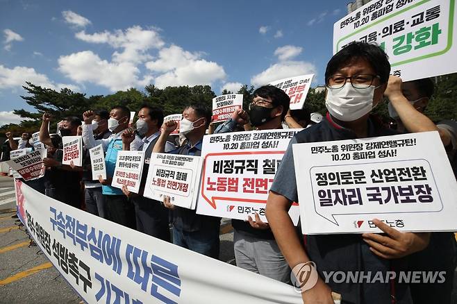 (서울=연합뉴스) 박동주 기자 = 양경수 전국민주노동조합총연맹(민주노총) 위원장에 대한 구속적부심이 열리는 15일 오후 서초구 서울중앙지법 앞에서 양 위원장 불구속 재판 촉구 민주노총 중앙집행위원회 기자회견이 열리고 있다. 2021.9.15