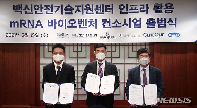 [서울=뉴시스] 김선웅 기자 = 15일 서울 강남구 그랜드 인터컨티넨탈 서울 파르나스호텔에서 열린 백신안전기술지원센터 인프라 활용 mRNA 바이오벤처 컨소시엄 출범식에서 참석 업체 대표자들이 기술 협력을 상호양해각서를 체결하고 있다. 왼쪽부터 정문섭 진원생명과학 이사, 조관구 큐라티스 대표, 조양제 아이진 기술총괄대표. 2021.09.15. mangusta@newsis.com