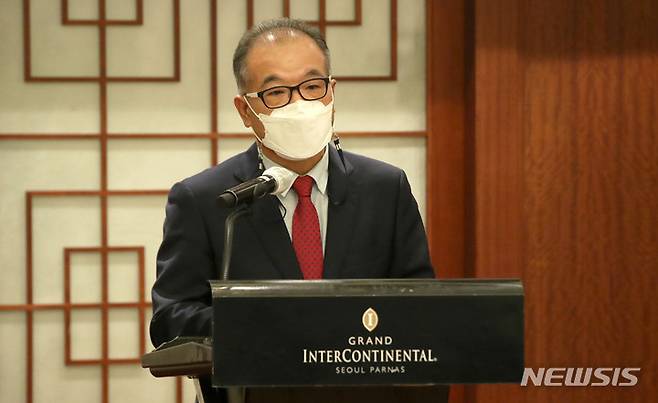 [서울=뉴시스] 김선웅 기자 = 황재연 백신안전기술지원센터장이 15일 서울 강남구 그랜드 인터컨티넨탈 서울 파르나스호텔에서 열린 백신안전기술지원센터 인프라 활용 mRNA 바이오벤처 컨소시엄 출범식에서 인사말을 하고 있다. 2021.09.15. mangusta@newsis.com