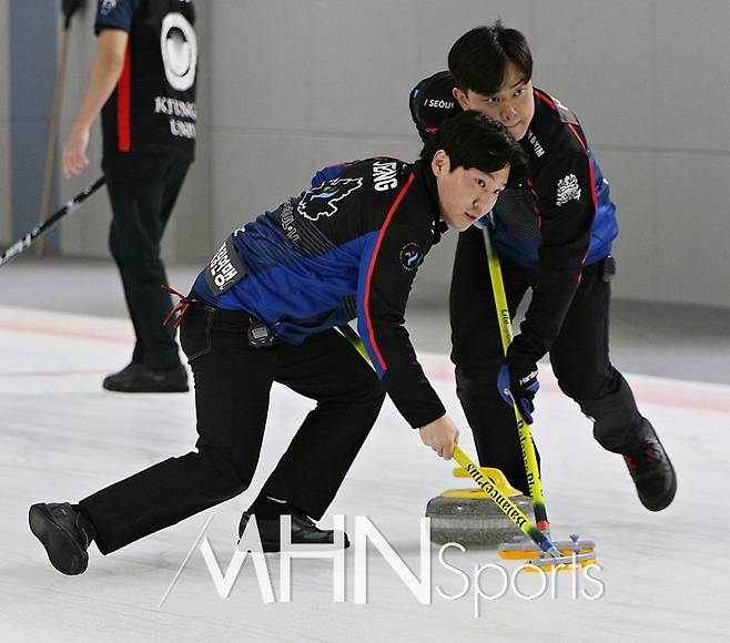 이날 서울컬링연맹 서드 정병진, 리드 황현준이 스위핑을 하고 있다.