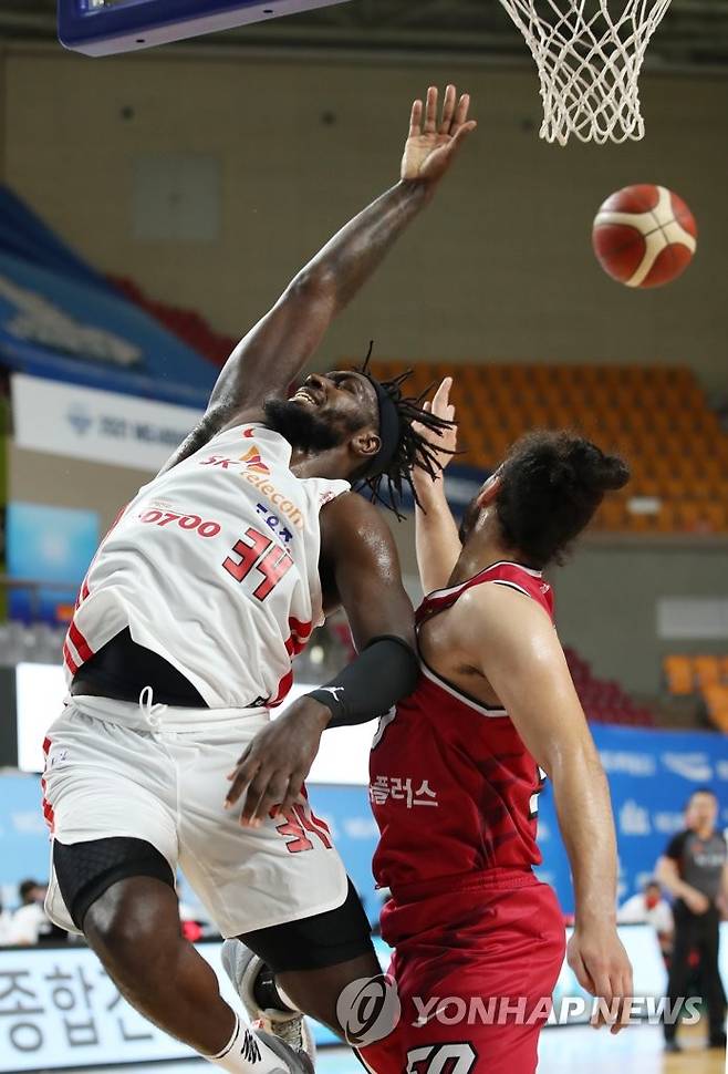 SK 자밀 워니와 LG 아셈 마레이가 공을 다투고 있다. 2021.9.15