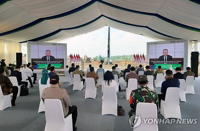 (카라왕=연합뉴스) 성혜미 특파원 = 15일 자카르타 외곽 카라왕 산업단지(KNIC)에서 열린 현대차 그룹과 LG에너지솔루션의 인도네시아 배터리셀 합작공장 착공식에서 정의선 현대차그룹 회장(화면)이 화상으로 축사하고 있다. 2021.9.15