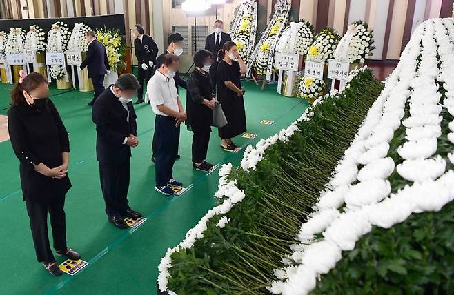 [서울=뉴시스] 15일 서울 여의도순복음교회 대성전 1층 베다니홀에 마련된 고 조용기 원로목사의 빈소에서 조문객들이 조문하고 있다. (사진=국민일보 제공) 2021.09.15. photo@newsis.com *재판매 및 DB 금지
