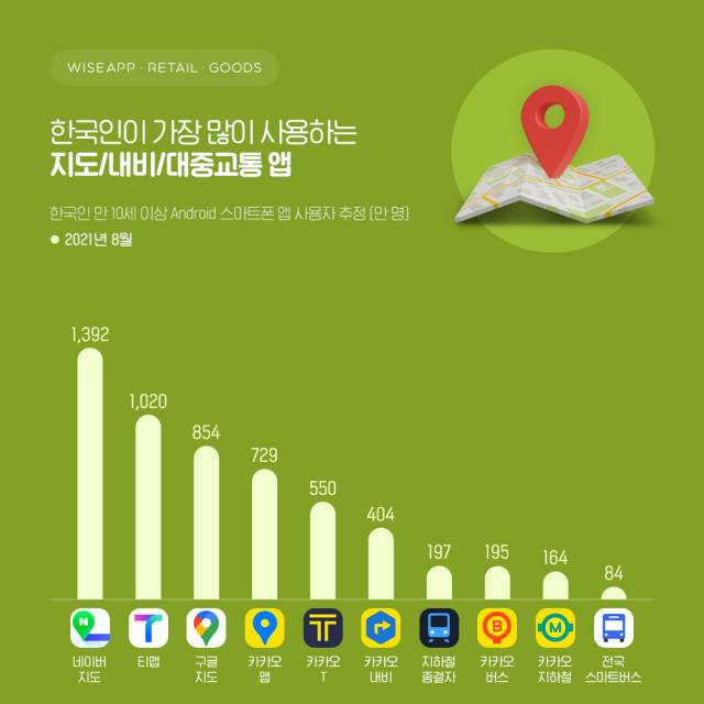 조사 결과 지난 8월에 사용자가 가장 많았던 길찾기 앱은 1,392만 명의 월간활성이용자(MAU)를 기록한 '네이버 지도'였다.