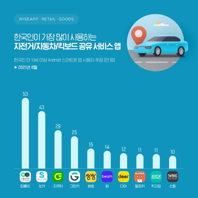 15일 앱 조사 분석업체 와이즈앱은 8월 한 달간 한국인이 가장 많이 이용한 모빌리티 서비스 관련 앱을 발표했다.