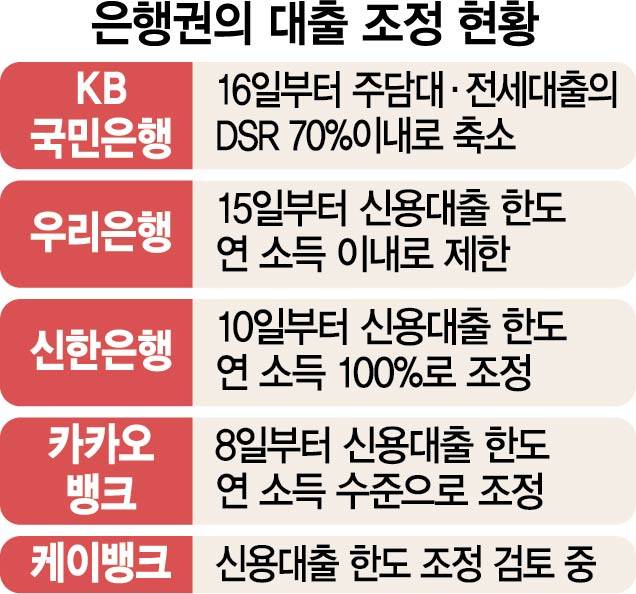 인터넷전문은행인 카카오뱅크 역시 8일 신용대출 한도를 연 소득 수준으로 낮추되, 최대 7,000만 원에서 최대 5,000만 원으로 추가로 낮췄다. 케이뱅크는 연 소득 이내로 신용대출 한도를 줄이기로 방침을 정하고 시기를 검토하고 있다.