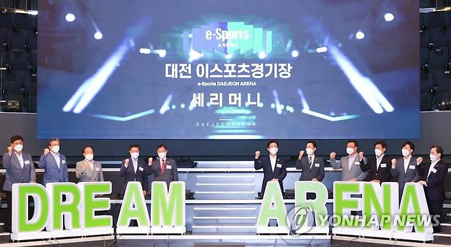 (대전=연합뉴스) 대전 e-스포츠 상설경기장이 15일 유성구 도룡동 엑스포과학공원 내 첨단과학관에 문을 열고 운영에 들어갔다. 사진은 허태정 대전시장 등 참석자들이 개관식에서 기념촬영을 하고 있다.2021.9.15 [대전시 제공. 재판매 및 DB 금지]