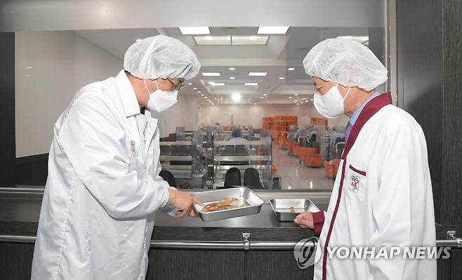 (서울=연합뉴스) 김강립 식품의약품안전처장이 추석을 앞둔 15일 홍삼을 제조하는 건강기능식품제조업체를 방문해 품질·위생관리 실태 및 코로나19 방역 관리 상황을 점검하고 있다. 2021.9.15