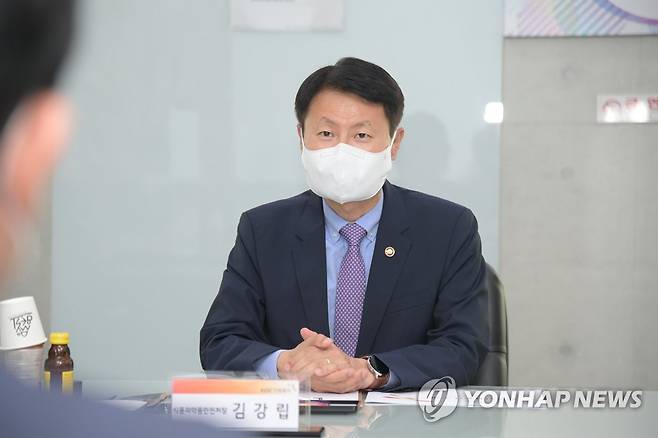 (서울=연합뉴스) 김강립 식품의약품안전처장이 추석을 앞둔 15일 홍삼을 제조하는 건강기능식품제조업체를 방문해 관계자들과 간담회를 하고 있다. 2021.9.15