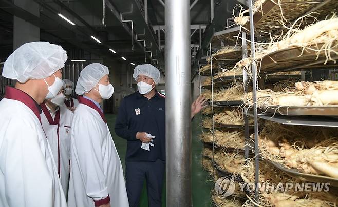 (서울=연합뉴스) 김강립 식품의약품안전처장이 추석을 앞둔 15일 홍삼을 제조하는 건강기능식품제조업체를 방문해 품질·위생관리 실태 및 코로나19 방역 관리 상황을 점검하고 있다. 2021.9.15