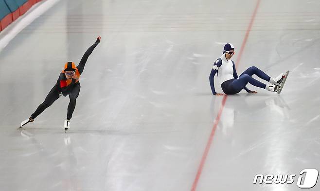 (서울=뉴스1) 안은나 기자 = 15일 서울 노원구 태릉국제스케이트장에서 열린 SK텔레콤배 제56회 전국남녀 종목별 스피드스케이팅 선수권대회 여자 500m 결승에서 이나현(노원고)이 넘어지고 있다. 왼쪽은 김민선. 김민선은 38.65로 1위를 차지했다. 2021.9.15/뉴스1