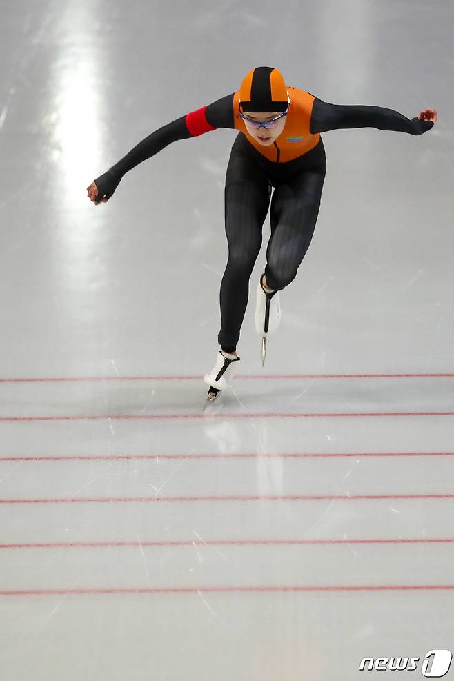 (서울=뉴스1) 안은나 기자 = 15일 서울 노원구 태릉국제스케이트장에서 열린 SK텔레콤배 제56회 전국남녀 종목별 스피드스케이팅 선수권대회 여자 500m 결승에서 김민선(의정부시청)이 결승선을 통과하고 있다. 김민선은 38.65로 1위를 차지했다. 2021.9.15/뉴스1