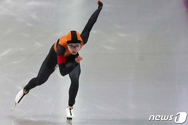 (서울=뉴스1) 안은나 기자 = 15일 서울 노원구 태릉국제스케이트장에서 열린 SK텔레콤배 제56회 전국남녀 종목별 스피드스케이팅 선수권대회 여자 500m 결승에서 김민선(의정부시청)이 역주하고 있다. 김민선은 38.65로 1위를 차지했다. 2021.9.15/뉴스1