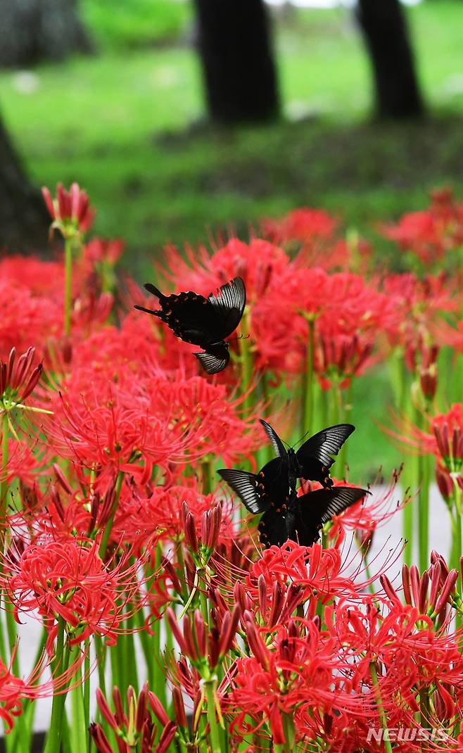 [남해=뉴시스] 차용현 기자 = 15일 오후 경남 남해군 이동면 신전숲에서 붉은 꽃망울을 터뜨린 꽃무릇 주위를 제비나비 한 무리가 날아다니고 있다. 2021.09.15. con@newsis.com