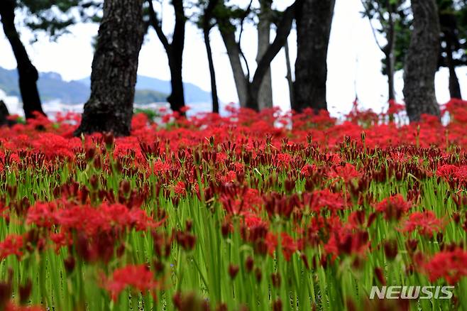[남해=뉴시스] 차용현 기자 = 15일 오후 경남 남해군 이동면 신전숲에서 붉은 꽃망울을 터뜨린 ‘꽃무릇’이 눈길을 사로잡고 있다. 2021.09.15. con@newsis.com