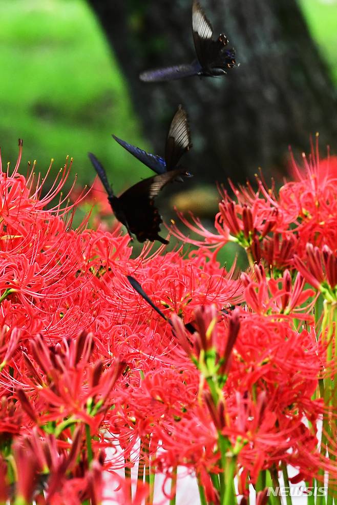 [남해=뉴시스] 차용현 기자 = 15일 오후 경남 남해군 이동면 신전숲에서 붉은 꽃망울을 터뜨린 꽃무릇 주위를 제비나비 한 무리가 날아다니고 있다. 2021.09.15. con@newsis.com