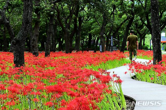 [남해=뉴시스] 차용현 기자 = 15일 오후 경남 남해군 이동면 신전숲에서 한 주민이 붉은 꽃망울을 터뜨린 ‘꽃무릇’ 산책로를 걸어가고 있다. 2021.09.15. con@newsis.com