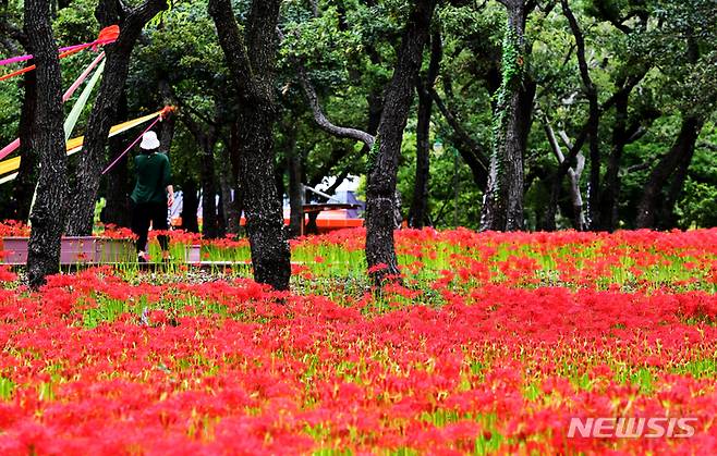 [남해=뉴시스] 차용현 기자 = 15일 오후 경남 남해군 이동면 신전숲에서 한 주민이 ‘꽃무릇’ 산책로를 걸어가고 있다. 2021.09.15. con@newsis.com