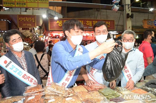 [청주=뉴시스] 조성현 기자 = 15일 오후 충북 청주시 육거리 종합시장을 방문한 국민의힘 이준석 당 대표가 추석을 앞두고 전통시장에서 장을 보고 있다. 2021.09.15. jsh0128@newsis.com