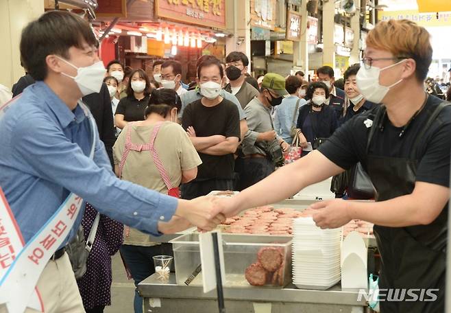 [청주=뉴시스] 조성현 기자 = 15일 오후 충북 청주시 육거리 종합시장을 방문한 국민의힘 이준석 당 대표가 상인과 인사를 나누고 있다. 2021.09.15. jsh0128@newsis.com