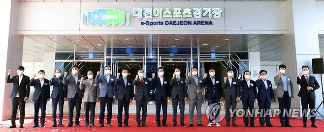 (서울=연합뉴스) 오영우 문화체육관광부 제1차관(왼쪽 여덟번째)이 15일 대전 유성구 대전 이스포츠 경기장에서 열린 개장식에 참석해 허태정 대전시장(왼쪽 아홉번째) 및 주요내빈들과 현판 제막 후 기념촬영을 하고 있다. 2021.9.15