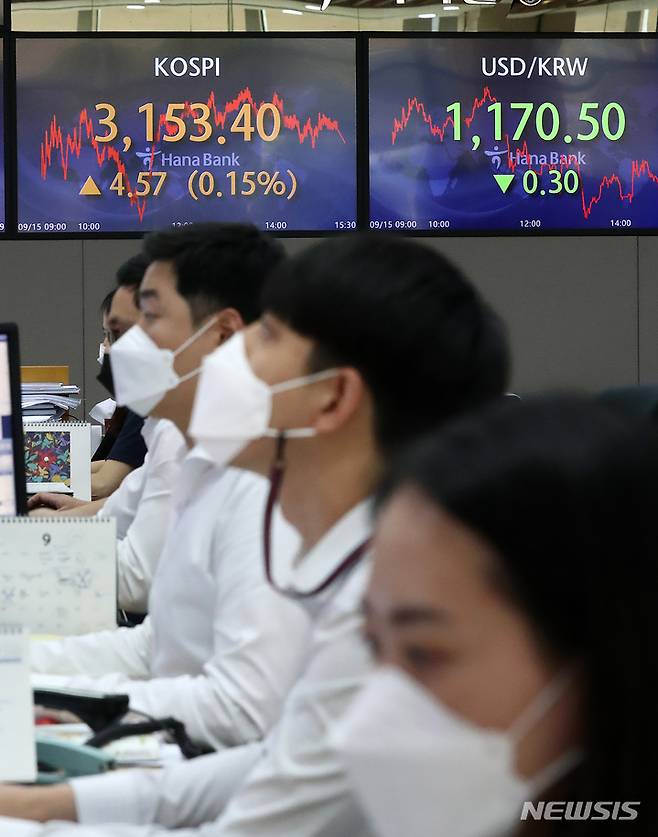 [서울=뉴시스] 이영환 기자 = 코스피가 전 거래일 보다 4.57포인트(0.15%)오른 3153.40에 장을 마감한 15일 오후 서울 중구 하나은행 딜링룸 전광판에 지수가 표시되어 있다. 이날 코스닥지수는 전 거래일 보다 5.05포인트(0.49%) 상승한 1042.79, 원·달러 환율은 전 거래일 보다 0.3원 내린 1170.5원에 마감했다. 2021.09.15. 20hwan@newsis.com