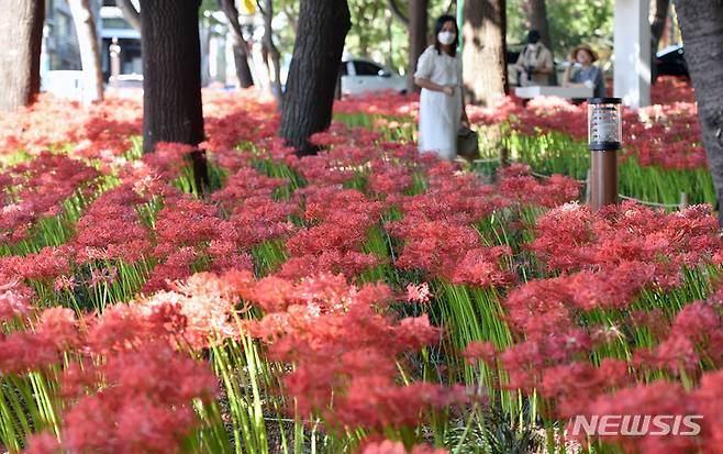 [대구=뉴시스] 이무열 기자 = 완연한 가을 날씨를 보인 15일 오후 대구 서구 그린웨이에 붉고 화사한 꽃무릇이 활짝 꽃망울을 터뜨려 시민들의 눈길을 끌고 있다. 2021.09.15. lmy@newsis.com