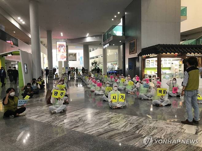 (광주=연합뉴스) 15일 오전 광주 서구 광주시청 로비에서 보건의료노조 호남권역재활병원지부 노조원들이 청사 점거 농성을 벌이고 있다. 2021.9.15 [보건의료노조 호남권역재활병원지부 제공. 재판매 및 DB 금지]