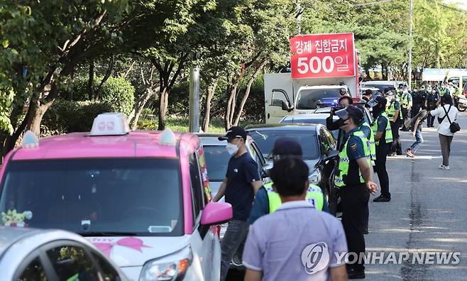 (서울=연합뉴스) 한상균 기자 = 한국유흥음식업중앙회 수도권 회원들이 15일 국회 앞에서 코로나19 방역 조치인 집합금지 해제 촉구 기자회견 후 차량 시위를 하고 있다. 2021.9.15