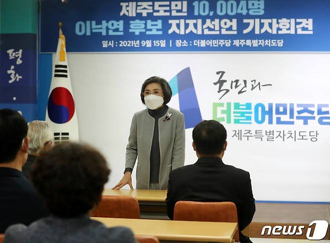 (제주=뉴스1) 홍수영 기자 = 이낙연 더불어민주당 대선 후보의 부인 김숙희씨가 15일 민주당 제주도당에서 열린 도민 1만명 지지선언 기자회견에 참석해 인사를 나누고 있다.2021.9.15/뉴스1