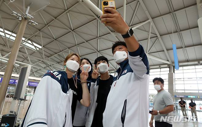 [인천공항=뉴시스] 추상철 기자 = 여자 양궁 대표팀 강채영(왼쪽부터), 장민희, 안산이 15일 오후 인천국제공항에서 2021 세계양궁선수권대회 참가를 위해 출국하기 전 휴대폰 카메라로 기념촬영을 하고 있다. 이번 대회는 오는 19일부터 26일까지 미국 양크턴에서 8일간 치러진다.2021.09.15. scchoo@newsis.com