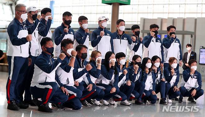 [인천공항=뉴시스] 추상철 기자 = 2021 세계양궁선수권대회에 참가하는 남녀 양궁 대표팀이 15일 오후 인천국제공항에서 출국에 앞서 기념촬영을 하고 있다. 2021.09.15. scchoo@newsis.com