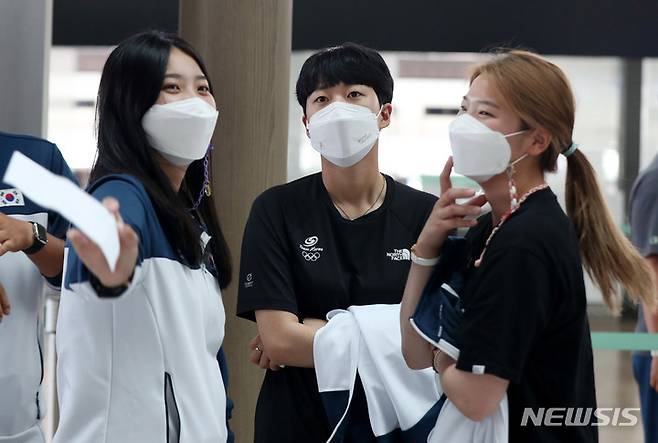 [인천공항=뉴시스] 추상철 기자 = 여자 양궁 대표팀 장민희(왼쪽부터), 안산, 강채영이 15일 오후 인천국제공항에서 2021 세계양궁선수권대회 참가를 위해 출국하기 전 대화를 나누고 있다. 이번 대회는 오는 19일부터 26일까지 미국 양크턴에서 8일간 치러진다.2021.09.15. scchoo@newsis.com