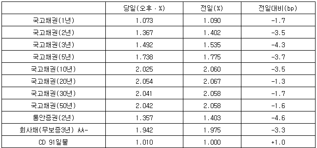 30년물과 50년물은 각각 1.7bp 하락, 1.6bp 하락으로 연 2.041%, 연 2.042%를 기록했다.