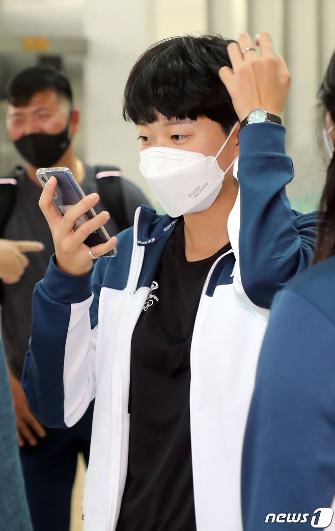 (인천공항=뉴스1) 황기선 기자 = 대한민국 여자 양궁 국가대표팀 안산이 15일 오후 인천국제공항에서 출국 전 머리를 다듬고 있다. 대표팀은 오는 19일부터 26일까지 미국 양크턴에서 열리는 2021 세계양궁선수권대회 출전한다. 2021.9.15/뉴스1