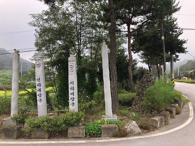 | ▲ 슬치 고갯마루 돌장승 슬치 고갯마루 삼거리에 천하대장군 지하여장군이 돌장승이고, 솟대도 돌기둥이다. 석등슬치로 도로 이름과 어울린다. |