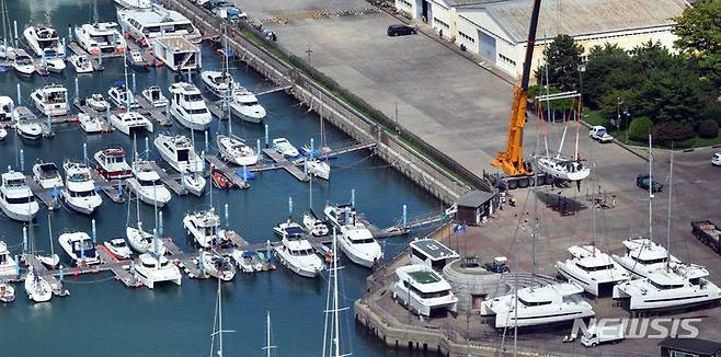 [부산=뉴시스] 하경민 기자 = 제14호 태풍 '찬투'(CHANTHU)가 북상 중인 15일 부산 해운대구 수영만요트경기장에서 관계자들이 크레인을 동원해 요트를 육지로 옮기고 있다. 선박 입출항과 부두 하역작업 등 부산항 운영은 오는 16일 오후 6시부터 일시 중단된다. 2021.09.15. yulnetphoto@newsis.com