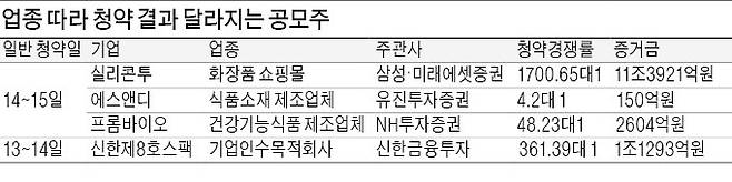 15일 금융투자업계에 따르면 건강기능식품 제조업체 프롬바이오를 비롯해 식품소재 제조업체 에스앤디, 화장품 쇼핑몰 실리콘투 등 3곳 기업의 공모주 일반청약이 지난 14일부터 이틀간 진행됐다. 같은 날 청약을 진행한 세 기업 중 가장 흥행에 성공한 곳은 실리콘투다. 삼성증권과 미래에셋증권 등에서 진행된 청약에서 총 4억7310만8534주의 주문이 들어와 1700.65 대 1의 경쟁률을 냈다. 증거금은 11조3921억원을 모았다.