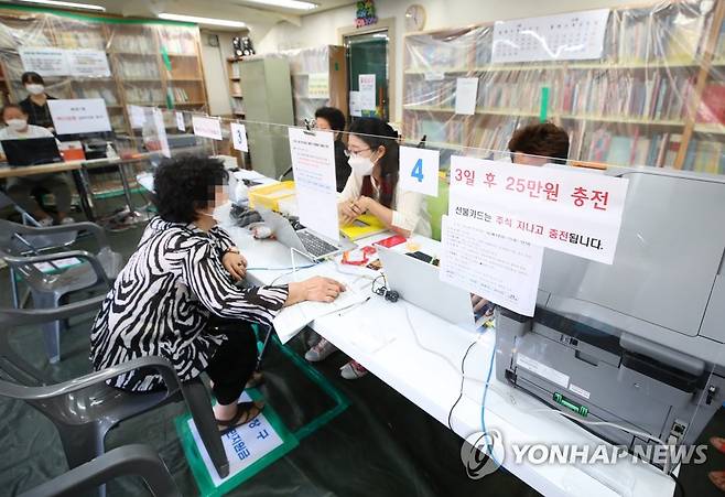 (고양=연합뉴스) 김도훈 기자 = 경기도 전 도민에 대한 재난지원금(3차 재난기본소득) 지급 내용을 담은 경기도 제3회 추가경정 예산안이 경기도의회를 통과한 15일 오후 경기도 고양시 덕양구 화정1동 행정복지센터를 찾은 시민이 재난지원금 관련 상담을 받고 있다.