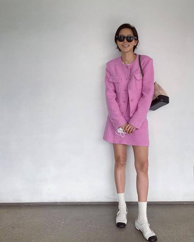 클래식 중의 클래식 아이템, 트위드 스커트 셋업으로 우아하고 고급스러운룩을 연출한 김나영. 독특한 텍스쳐의 핑크 원단, 세미 A라인의 스커트, 여기에 백팩을 더한 스타일링은 너무 드레스업 한 느낌에서 벗어나 발랄한 느낌을 더해주었다.