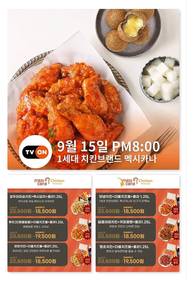 이날 쇼핑라이브 방송에는 멕시카나치킨 할인세트메뉴가 판매된다. 반반치킨·더블치즈볼·콜라1.25, 양념치킨·더블치즈볼·콜라1.25, 달콤라떼치킨·커피콩빵·콜라1.25 등이다.