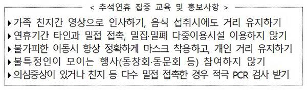교육부는 학생과 교직원 등에게 추석 연휴 기간 이동 및 대면 접촉을 최소화하고, 연휴 이후 자가진단을 실시해 이상이 있는 경우 등교하지 말 것을 당부했다.