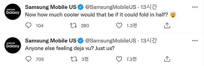 삼성전자는 오늘 미국 법인 공식 트위터 계정에서 애플이 새로운 아이폰을 공개한 직후 "데자뷔를 느끼는 사람은 우리뿐이야?"라며 아이폰13 시리즈가 전작 아이폰12 시리즈와 크게 차이가 없는 점을 꼬집었습니다.