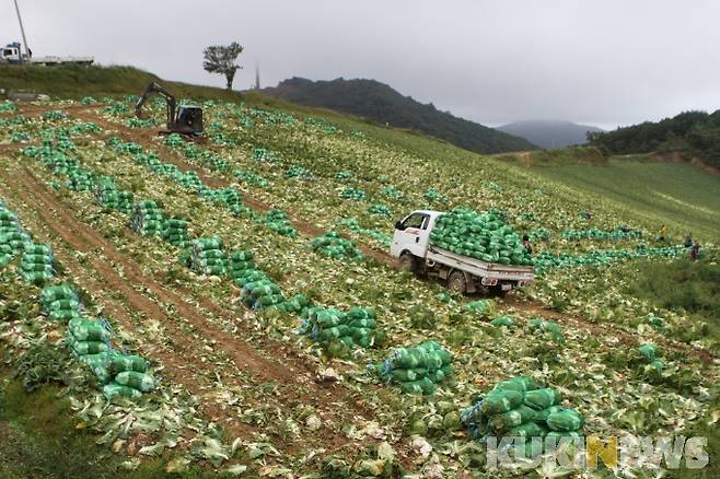 [강릉=쿠키뉴스] 한윤식 기자 = 15일 오후 국내최대 고랭지배추 주산지인 강원 강릉시 왕산면 안반데기에서 가을배추 수확이 한창이다.