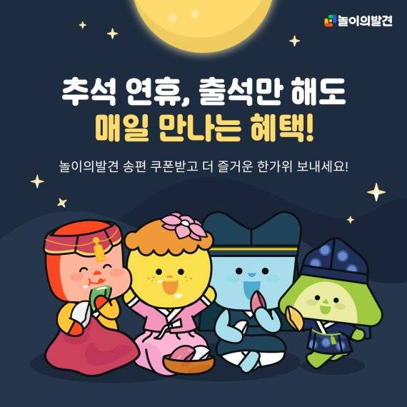 웅진그룹 키즈놀이 앱 '놀이의발견'이 출석만 하면 최대 3만원 상당의 할인 쿠폰을 지급하는 추석 스페셜 이벤트를 실시한다고 15일 밝혔다.