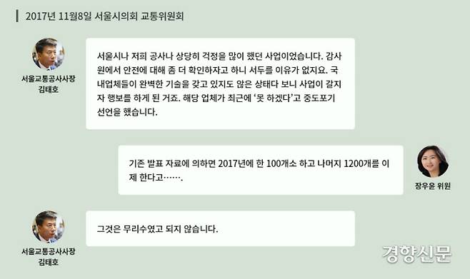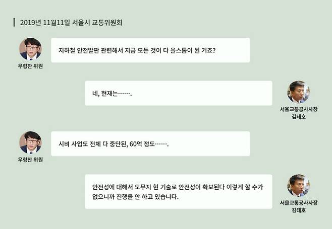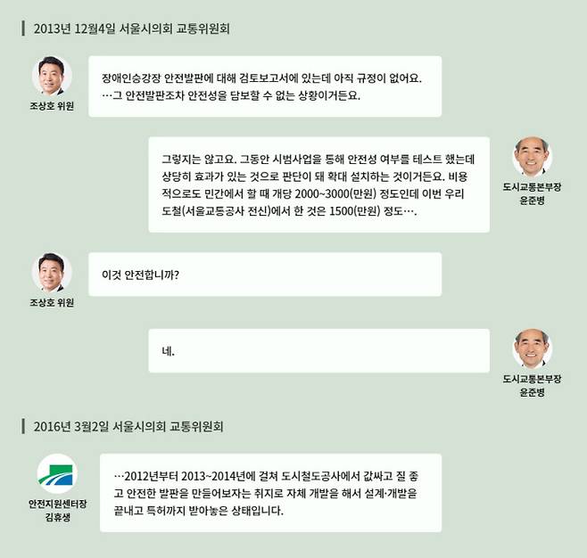 1300여개 계획 중 현재 설치된 자동안전발판은 0개다(*3호선 경찰병원역, 9호선 한성백제역은 계획 외 사업). ‘획기적 사고 감소’를 공언했던 서울시 계획은 왜 흐지부지 됐을까. 서울시의회 회의록에 그 흔적이 남아있다.