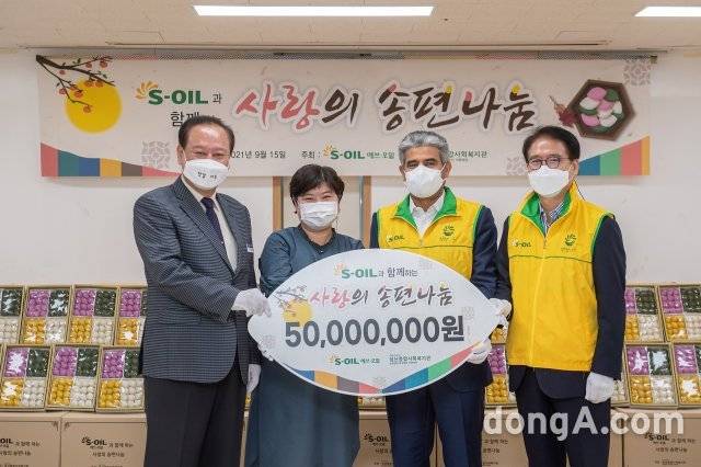 에쓰오일(S-OIL)은 15일 서울 마포구 이대 성산종합사회복지관에서 '에쓰오일과 함께하는 사랑의 송편나눔' 전달식을 갖고 저소득가정을 위해 5000만 원 상당 추석 선물 꾸러미를 제공했다.