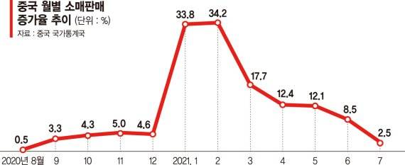 중국 소매판매는 지난해 12월 4.6%로 떨어졌다가 올해 3월 기저효과로 34.2%까지 정점을 찍었다. 그러나 이후 4월 17.7%, 5월 12.4%, 6월 12.1%, 7월 8.5% 등 점차 하락 추세다.