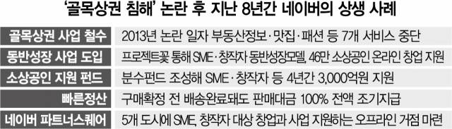 네이버는 2013년 맛집 비교, 부동산 매물 정보, 웹소설 등 온갖 사업에 진출하며 중소업체들과 잇단 충돌을 일으켰다. 네이버의 무분별한 사업 확장을 막기 위해 국회에서 이른바 ‘네이버 규제법’까지 추진됐다. 논란이 커지자 네이버는 상생협의체를 구성하고 맛집·알람·패션SNS 등 7개 사업에서 철수하기로 결정했다. 중소상공인(SME) 지원 프로그램인 ‘프로젝트 꽃’을 출범했고 SME와 창작자의 온라인 사업 등을 지원하는 600억 원 규모의 ‘분수펀드’도 조성했다. 사업도 국내보다 해외에 힘을 쏟았다. 네이버 창업자인 이해진 글로벌투자책임자(GIO)가 “국내에서 무리하게 사업하지 말고 글로벌 사업을 가장 우선하라”고 당부했을 정도다.
